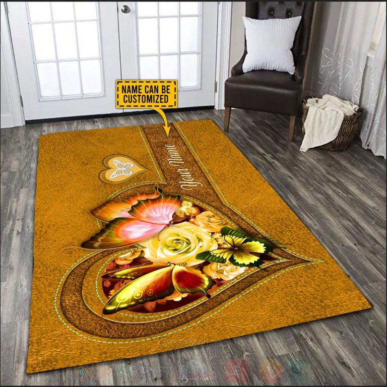 Butterfly-Flower Heart Custom Name Yellow Rug
